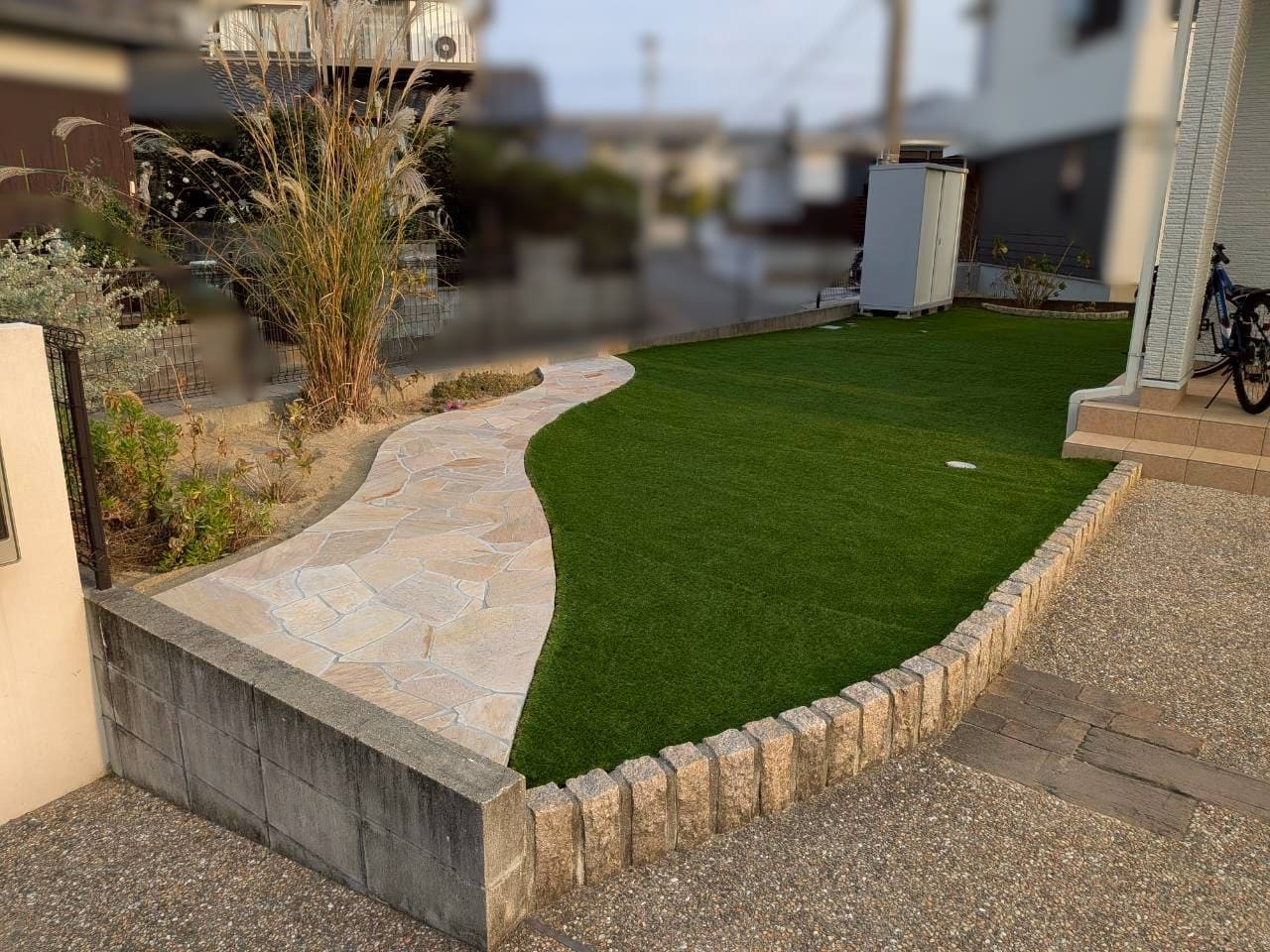 境界ブロックに化粧ブロックをセレクトするとブロック塗装よりも工期を節約でき、お洒落な雰囲気に!アプローチや花壇にレンガ材を使用することでお庭の雰囲気も一新されます。 -