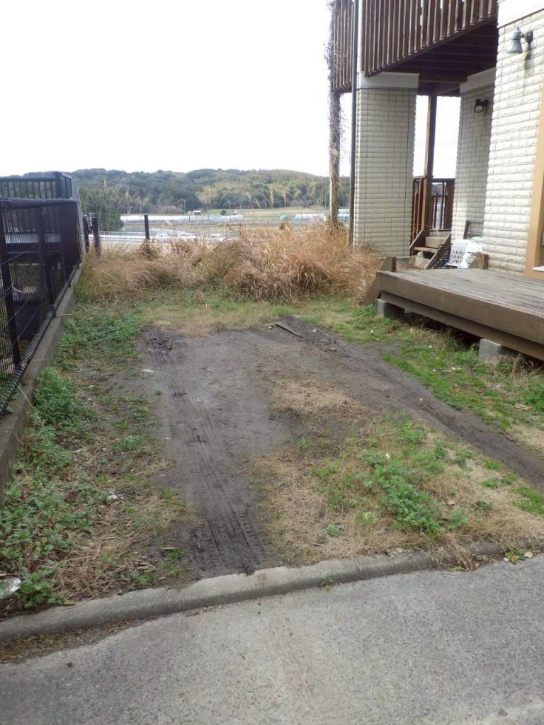 側庭に、車を停められるとのことで、タイヤが通る部分にコンクリート土間を施工しました。