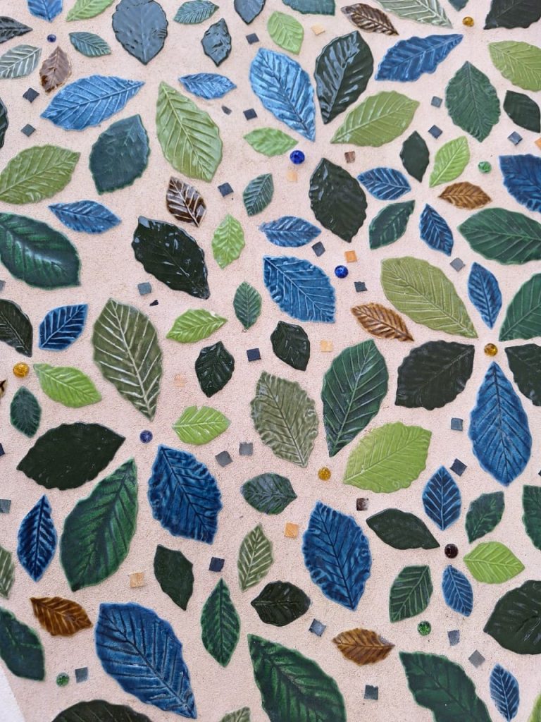 お庭にベンチを施工!座る部分に、葉っぱ模様の綺麗なタイルとお施主様のアイデアでビー玉を✨