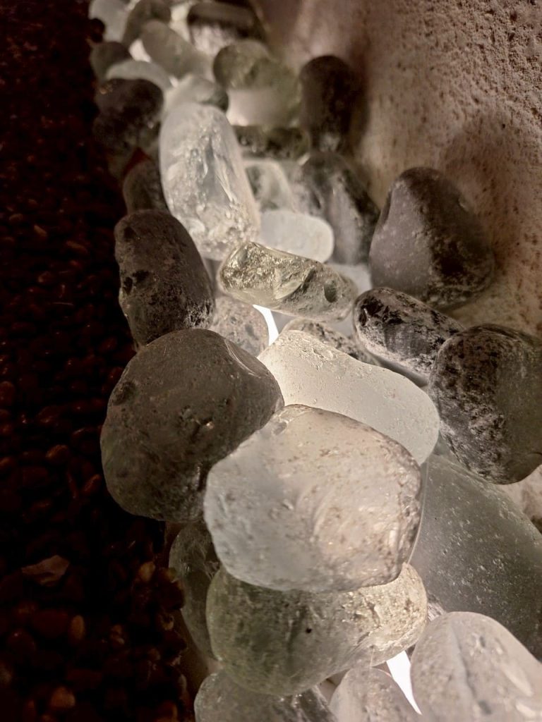 通路には、元々地被が植えてあったのを撤去し、ラインライトの上にガラスの石を!