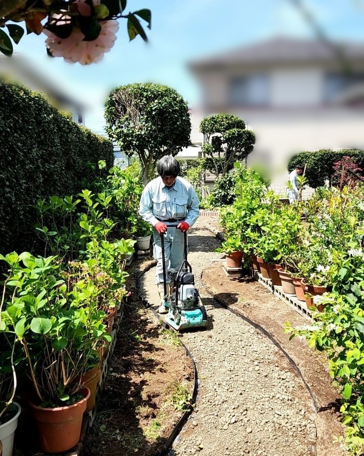 ↑下地の砕石を敷いた後、転圧している様子です。