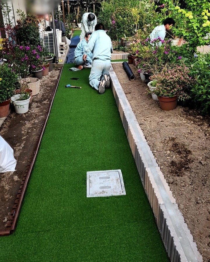 ↑人工芝張り作業中… 人工芝を施工場所に合わせて