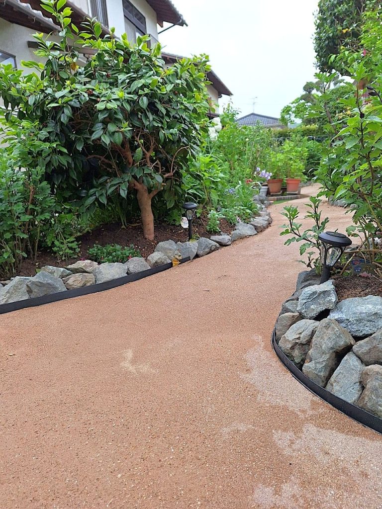 “固まる真砂土”で小路を造ると、洗い出し舗装や乱形石の舗装に比べ、